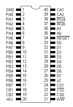 Układ ten nie jest projektem firmy Atari - w przeciwieństwie do ANTIC-a, POKEY-a i GTIA. Spotkałem się z różnymi jego oznaczeniami: 6520, 6521, 6821. Układ steruje pracą układu MMU, obsługuje joysticki i steruje sygnałami pomocniczymi przy transmisji szeregowej. Oto opis wyprowadzeń: